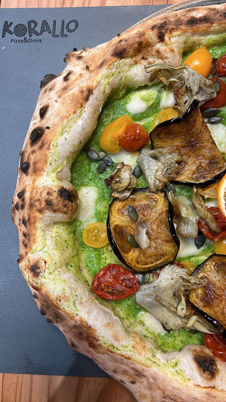 Proposed with the Alternative dough with homemade pumpkin cream, vegan raw ham, vegan mozzarella, rustic artichoke heart, fried eggplant, yellow cherry tomato, semidry red tomatoes, pumpkin seeds, fried basil